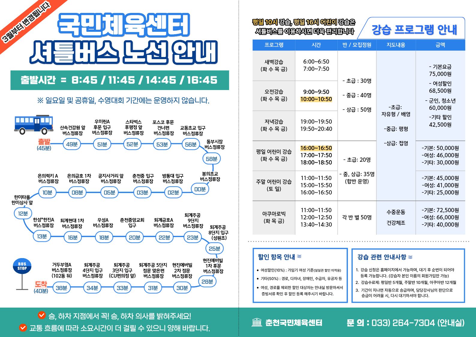 | 08:45, 11:45, 14:45, 16:45 | 국민체육센터 출발 | ||