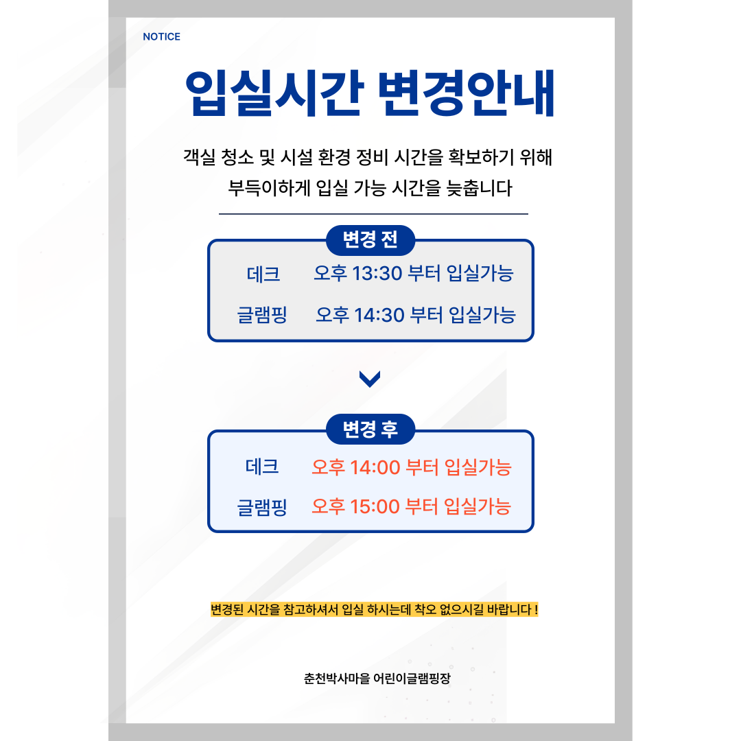 춘천박사마을 어린이글램핑장 입실 시간 변경 안내