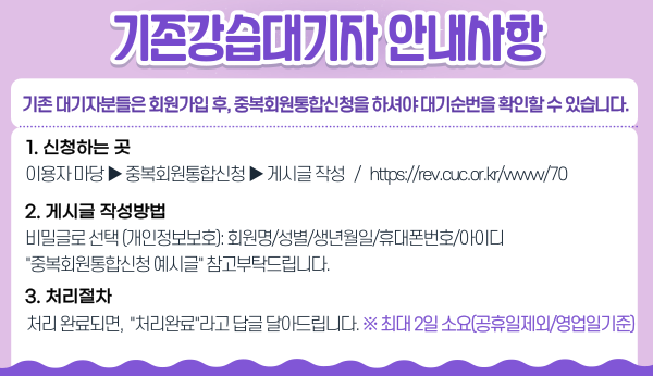 ※ 기존강습대기자: 신규통합예약시스템 도입전 "춘천도시공사 대표 홈페이지"에서 강습신청한 대기자