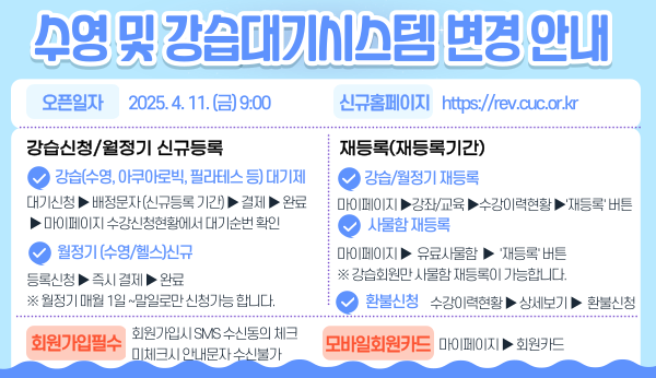 - 공사 운영 4개 수영장 대기 시스템 통합운영으로, 같은 종목은 1개의 시설만 대기 가능